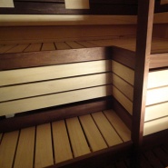 Что такое полок из термолипы. Это выпаренное дерево, которое обжигается при определённых температурах. Соответственно полок из термолипы получается тёмного цвета как по внешней стороне, так и внутри доски. Преимущества термодерева это отсутствие влажности по всей доске, где-то получается порядка 2% влажности. Соответственно полок из такой липы уже не ведёт, не греется, не надо обрабатывать, срок службы увеличивается в разы.